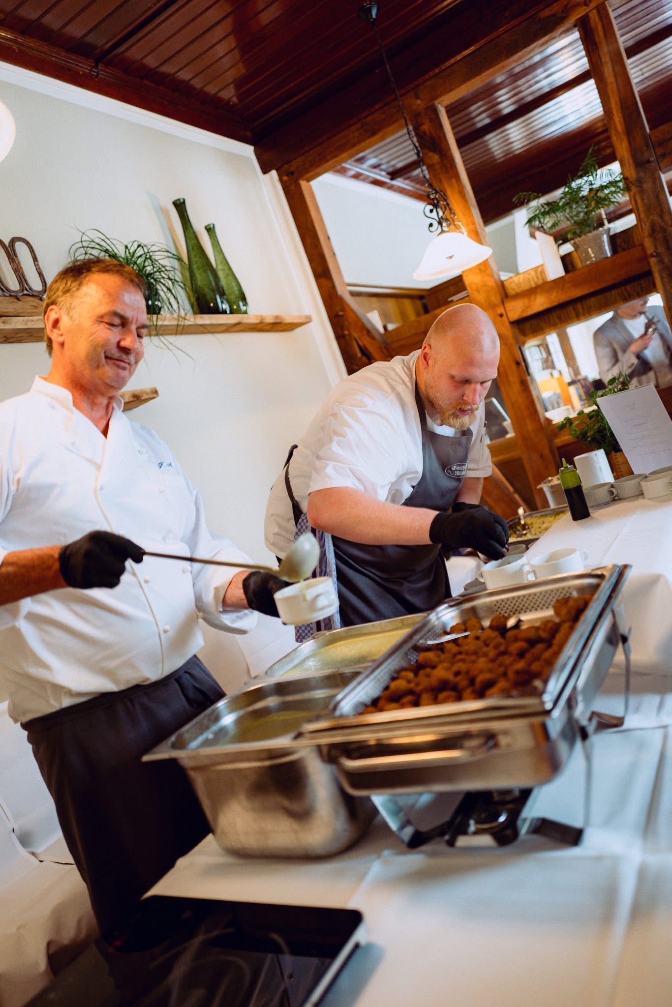 Eine Küchenschlacht by Gasthaus Müller ist pures Schlemmen ohne Reue. Von 11 bis 18 oder 15 bis 22 Uhr entstehen ca. alle halbe Stunde neue kleine Gerichte, frisch zubereitet und an wechselnden Stationen im ganzen Haus serviert – in der Küche, der kalten Küche, im Saal oder in der Gaststube.